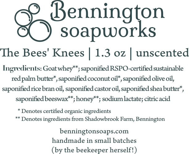 The honey and beeswax are from the soapmaker's apiary, and the goats' whey is a remnant from straining the Turkish-style yogurt the soapmaker creates from her neighbors' goat milk. All as local as it gets, from right here in Bennington.